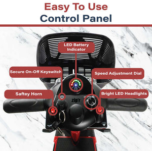 Simple and easily usable control panel. Easily steer, change direction, check battery range, reverse, turn on the headlights, use the horn, and set a maximum speed using the tiller. With the Zip'r Roo 3-wheel electric powered mobility scooter controls are all within arms reach.