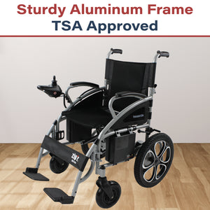 Ideal for traveling, the Transport Lite foldable electric wheelchair has a small footprint, only 16.5 inches wide when folded. Weighing in at 89 pounds, the Zip'r Transport Lite motorized wheelchair is constructed from heavy duty aluminum. Our power wheelchairs are TSA approved and a great mobility aid for travel.