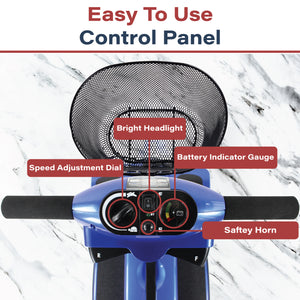 Generously padded & supportive seats. Easily adjustable seat height for an uncompromising ride. A swivel seat makes it easy to get on and off the Zip’r 4 Traveler. Ample storage space, a sturdy metal basket is included with every Zip'r 4-wheel electric powered mobility scooter.