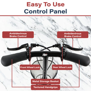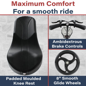 Steer and maneuver in indoor & outdoor spaces with the Zipr Pathfinder Leg Scooter. Features 4 smooth glide 8 inch flat-free non-marking wheels for effortless rolling. dual rear on-wheel brakes quickly bring you to a stop. With adjustable locking handbrakes keeping you in place. Move in tight spaces with ease.