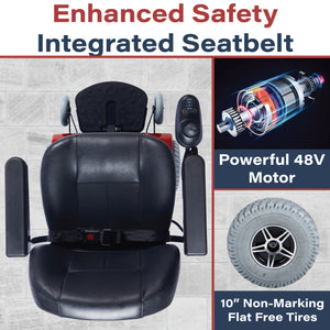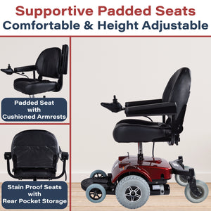 Heavy duty electric wheelchair with a powerful motor designed to support up to 300 lbs and travel up to 15 miles on a single charge. 20” best in class electric wheelchair turning radius great for narrow spaces. Easily maneuver over indoor and outdoor surfaces with comfort and ease.